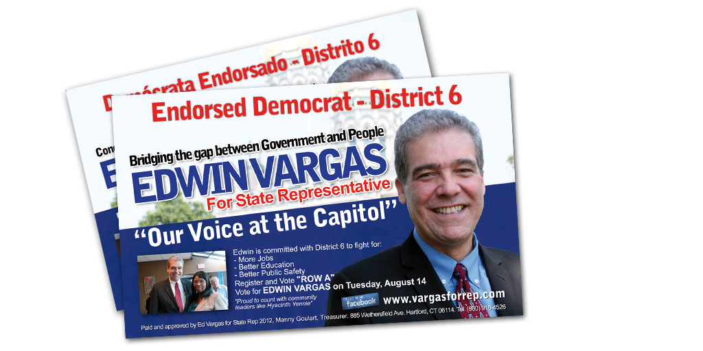Paid and approved by Ed Vargas for State Rep 2012, Manny Goulart, Treasurer. 885 Wethersfield Ave, Hartford, CT, 06114. Tel. (860) 916-4526.